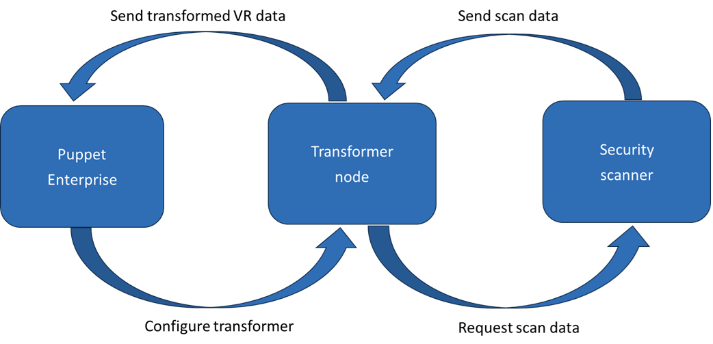 The transformer parses scan reports from your scanner and sends vulnerability information to Puppet Enterprise. This enables you to view the vulnerabilities in the PE console, see which Puppet-managed nodes are affected, and run vulnerability remediation patch jobs.