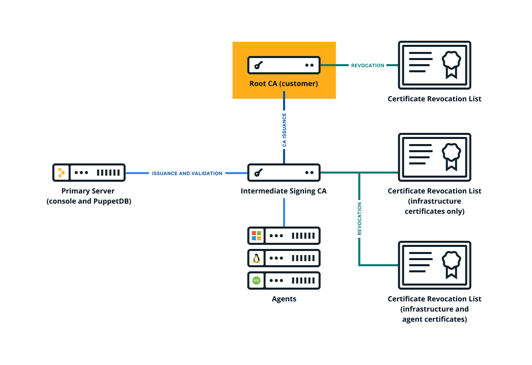 The built-in Puppet certificate authority automatically generates a root and intermediate certificate, but if you need additional intermediate certificates or prefer to use a public authority CA, you can set up an independent intermediate certificate authority. You must complete this configuration during installation.