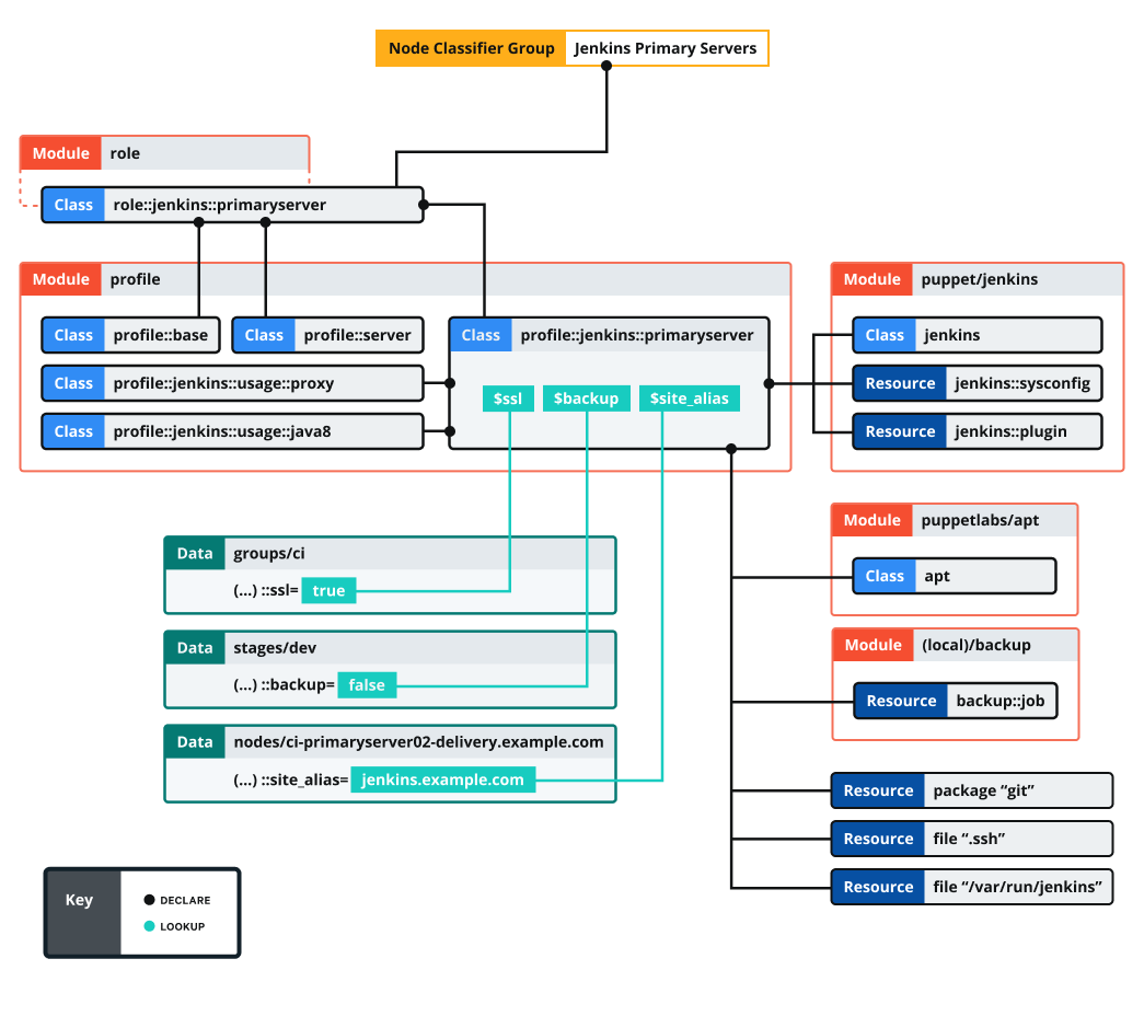 profile::jenkins::primaryserveruses puppet/jenkins, puppetlabs/apt, a home-built backup module, and somepackageandfileresources.) - Profiles can take configuration data from the console, Hiera or Puppet lookup. (In the diagram, three different hierarchy levels contribute data.)